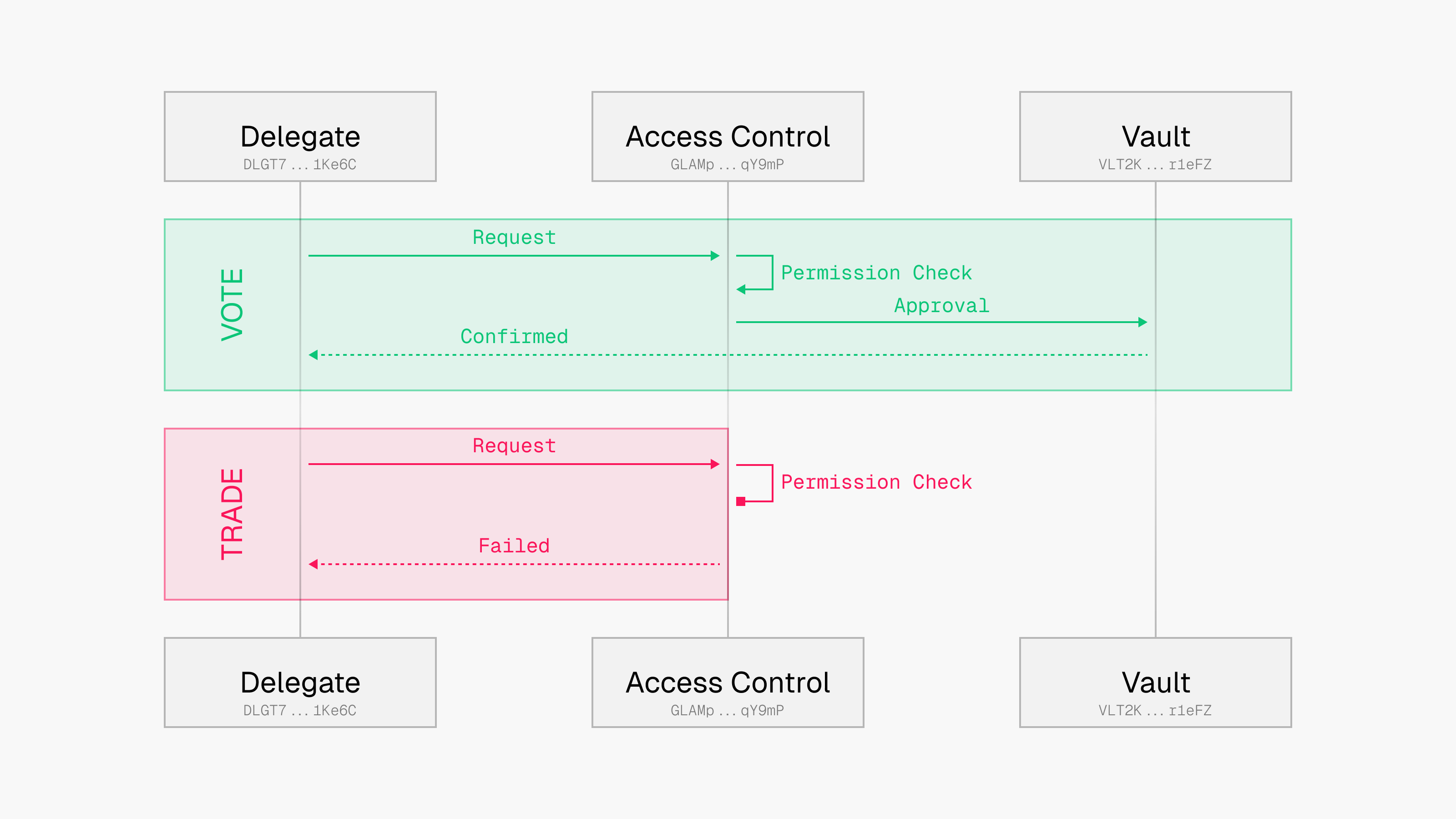 The vault owner designates a treasury delegate with specific permissions to manage protocol interactions. While this delegate can lend into and withdraw from authorized protocols, they cannot initiate unauthorized actions like transfers. This enables specialized treasury management while maintaining strict security controls. The vault owner grants a staking manager delegate permission to optimize staking positions across validators. While the delegate can execute stake and unstake instructions within defined parameters, they cannot perform unauthorized actions like swaps. This enables specialized stake management with robust security controls. The vault owner grants an AI optimizer delegate permission to automatically rebalance positions across lending protocols. While the delegate can move assets between integrated protocols to maximize returns, they cannot perform unauthorized actions like swaps. This enables automated yield optimization with strong security controls. The vault owner grants a governance delegate permission to participate in protocol governance. While the delegate can cast votes on behalf of the vault’s token holdings, they cannot perform unauthorized actions like trades. This enables automated governance with rigorous security controls.